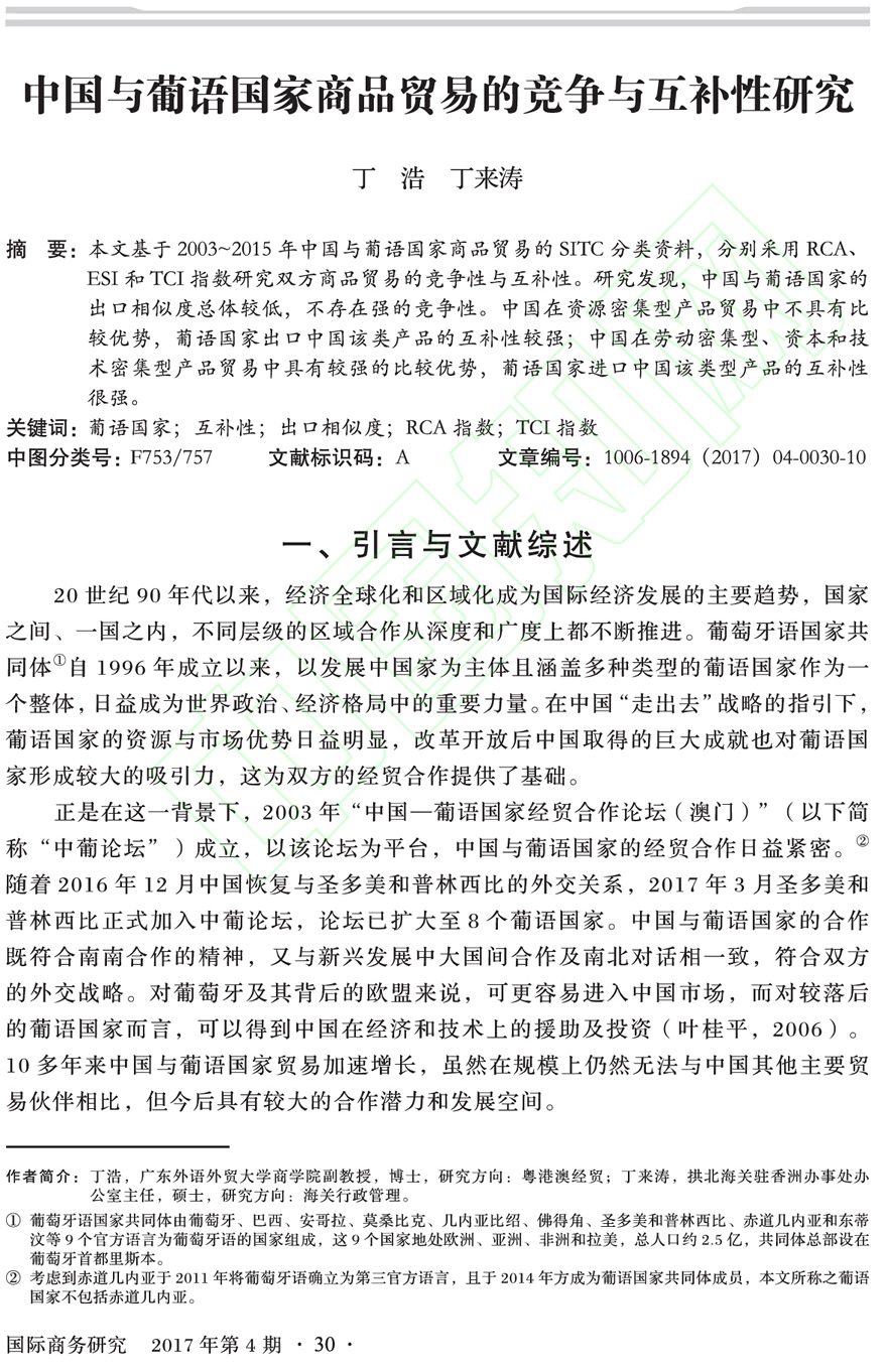 团队成员丁浩副教授撰写的“中国与葡语国家商品贸易的竞争与互补性研究”一文发表于《国际商务研究》2017年第4期。