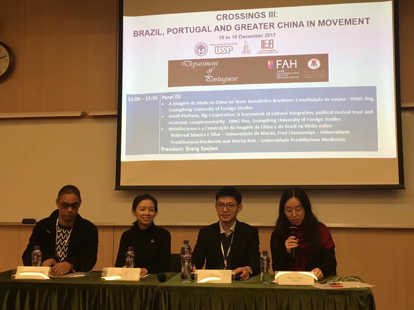 会议期间,丁浩作为特邀嘉宾做了题为“Small Platform, Big Cooperation: A Framework of Cultural Integration, Political Mutual Trust And Economic Complementarity”的主题发言,尚雪娇作为会议组委会成员,宣读了题为“INFLUÊNCIA INTERLINGUÍSTICA NA AQUISIÇÃO DEPORTUGUÊS LÍNGUA ESTRANGEIRA (葡萄牙语作为外语习得过程中的跨语言影响)”的学术论文,Bruna Morelo宣读了题为“NÓS FALAMOS PORTUGUÊS": TRABALHOS COM A ORALIDADE NO SUL DA CHINA(葡萄牙语口语教学探究)”的学术论文。