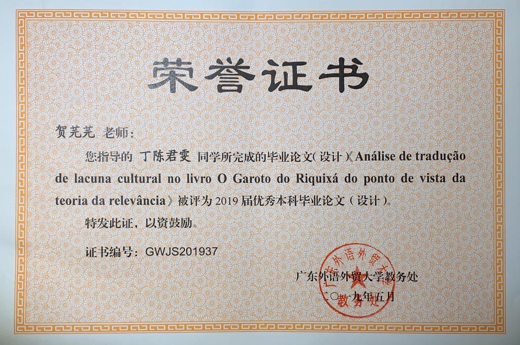 2019届本科生丁陈君雯撰写的“Análise de Tradução de Lacuna Cultural no Livro O Garoto Do Riquixá do Ponto de Vista da Teoria da Relevância(从关联理论视角分析《骆驼祥子》葡译本的文化缺省翻译)”论文也获评为其专业唯一优秀本科毕业论文,贺芫芫讲师担任论文指导老师。《骆驼祥子》是少有的拥有葡萄牙语直译本的中国文学作品。它由经典国际出版工程资助,是中国文化走出去的一个尝试。对这本书翻译情况的为探索更多更好的中葡翻译方法,促进中国文学在葡萄牙语世界的传播具有参考意义。