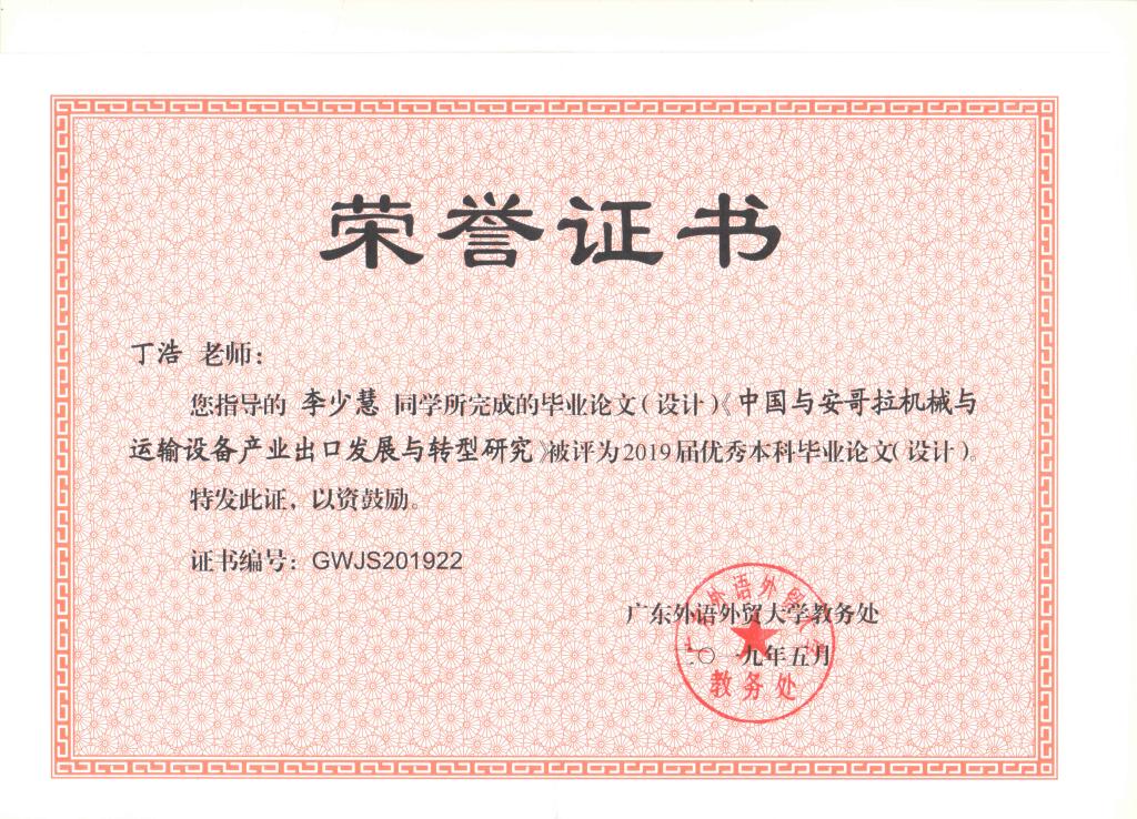 2019年5月,根据广东外语外贸大学2019届优秀本科毕业论文评选结果,2019届本科生李少慧撰写的“中国与安哥拉机械与运输设备产业出口发展与转型研究”论文获评为其专业唯一优秀本科毕业论文,丁浩副教授担任论文指导老师。在“一带一路”倡议和中非合作不断推进的背景下,论文聚焦于对中国与安哥拉商品贸易中的机械与运输设备类产品,基于该类细分产品的RNX、RCA、TCI和TCD等指数进行分析,与对于促进中国出口这一类重要产品并加强中安贸易合作具有参考意义。