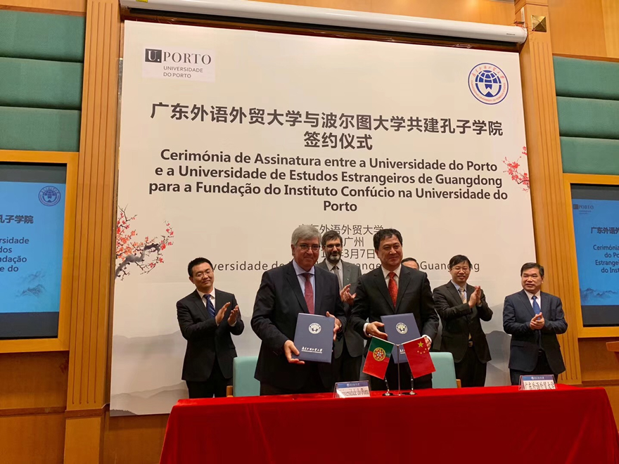2019年3月7日上午,广东外语外贸大学与葡萄牙波尔图大学共建孔子学院签约仪式暨中葡文化交流研讨会在广外北校区国际会议厅举行。孔子学院总部/国家汉办、省外办、省教育厅、广外与波尔图大学领导出席活动并致辞,中国-葡语国家研究创新团队成员见证签约仪式。