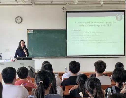 讲座伊始,尚雪娇老师强调,新时代的葡语教学应以服务“一带一路”建设、服务“粤港澳大湾区”建设作为新目标,探讨葡语人才培养的新模式。她从葡语教学的初级使用阶段、停滞阶段、恢复期和大发展时期的坎坷发展详细讲述了葡语在中国的发展历程,并引出了对我国未来培养高质量葡语人才的展望。为了使在场老师、学生深入了解葡语教学,她以广外的教学模式为例,讲到新型葡语教学不应只停留在听、说、读、写阶段,更应培养学生在翻译、研究、教学和管理等方面的实践能力。时代的转变对于葡语专业学生有了新的要求,交际能力固然重要,但更重要的是对我们国家本土文化的了解。