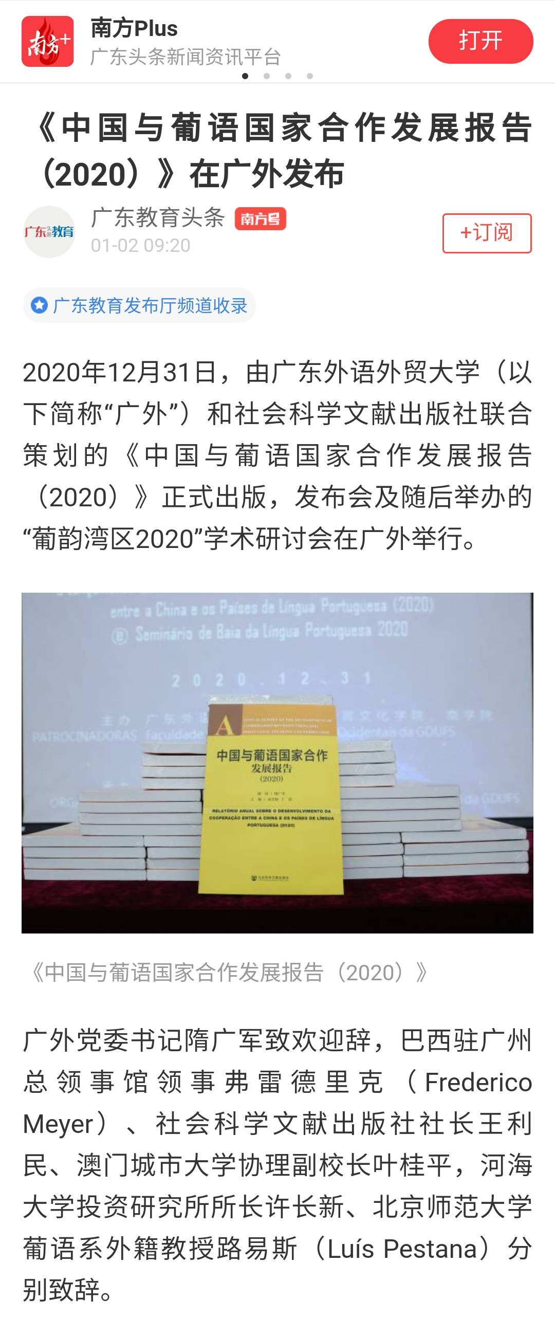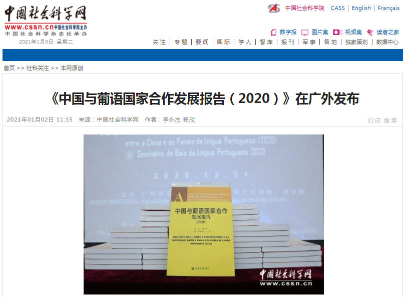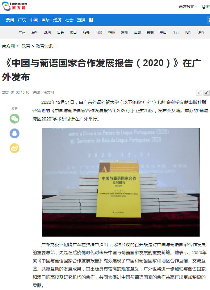 2. “南方+”(南方Plus),“《中国与葡语国家合作发展报告(2020)》在广外发布”(20200102)