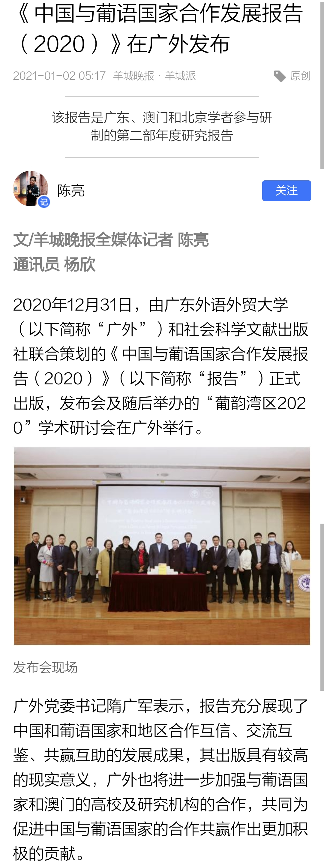 4. 羊城晚报•羊城派,“《中国与葡语国家合作发展报告(2020)》在广外发布”(20200102)